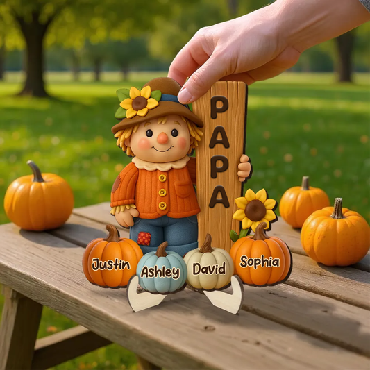 Adorable épouvantail et citrouilles – Plaque en bois personnalisée avec prénom(s) – Cadeau pour mamie