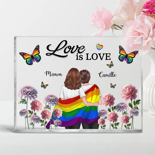 Plaque en acrylique personnalisée avec motif arc-en-ciel et 2 personnages – Cadeau pour couples LGBT