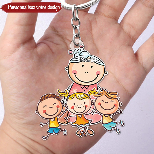 Porte-clés en acrylique personnalisé "Grand-mère et enfants en dessin animé"