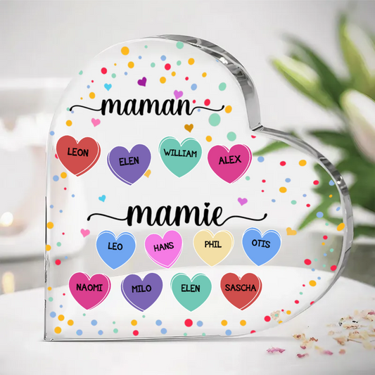 Cœur sur socle "D'abord maman, maintenant mamie" avec noms et fleurs de naissance