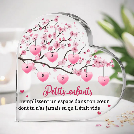 Coeur en acrylique avec arbre généalogique, de 1 à 8 noms, pour maman et mamie.
