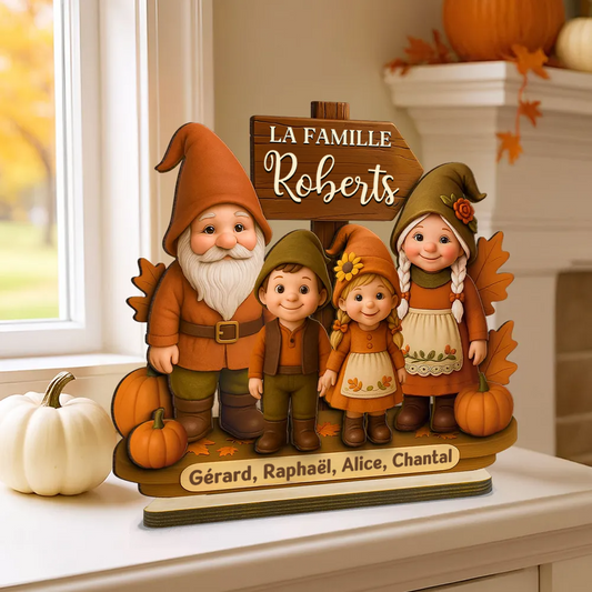Famille de gnomes saison d’automne – Plaque en bois personnalisée avec noms
