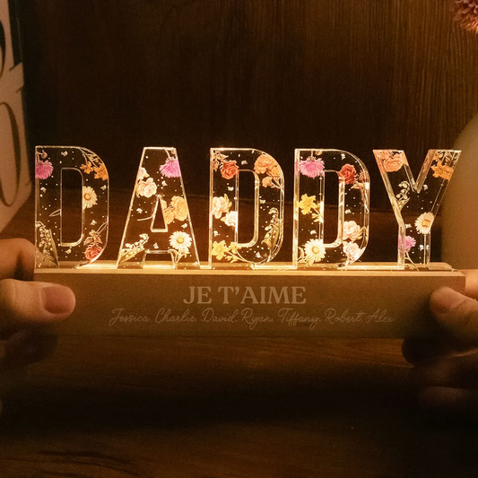 Veilleuse LED personnalisée DADDY avec fleurs de naissance, citations et prénoms – Cadeau pour papa