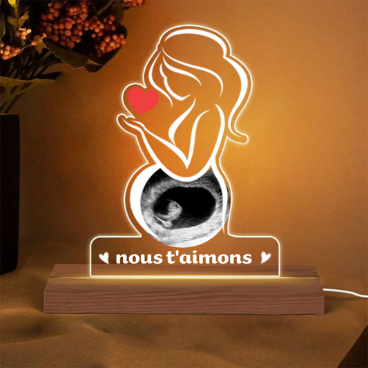 Lampe de Nuit Personnalisable en Acrylique - Silhouette de Femme Enceinte avec Image d'Échographie