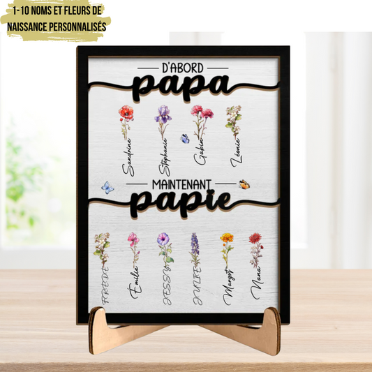 D'abord papa, maintenant Papie Plaque en bois avec fleurs de naissance