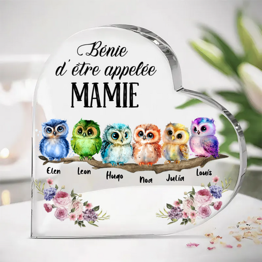 Cœur sur socle "D'abord maman, maintenant mamie" avec noms et fleurs de naissance