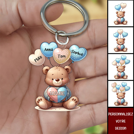 Porte-clés personnalisé « Amour d'ours avec ballons en forme de cœurs ».