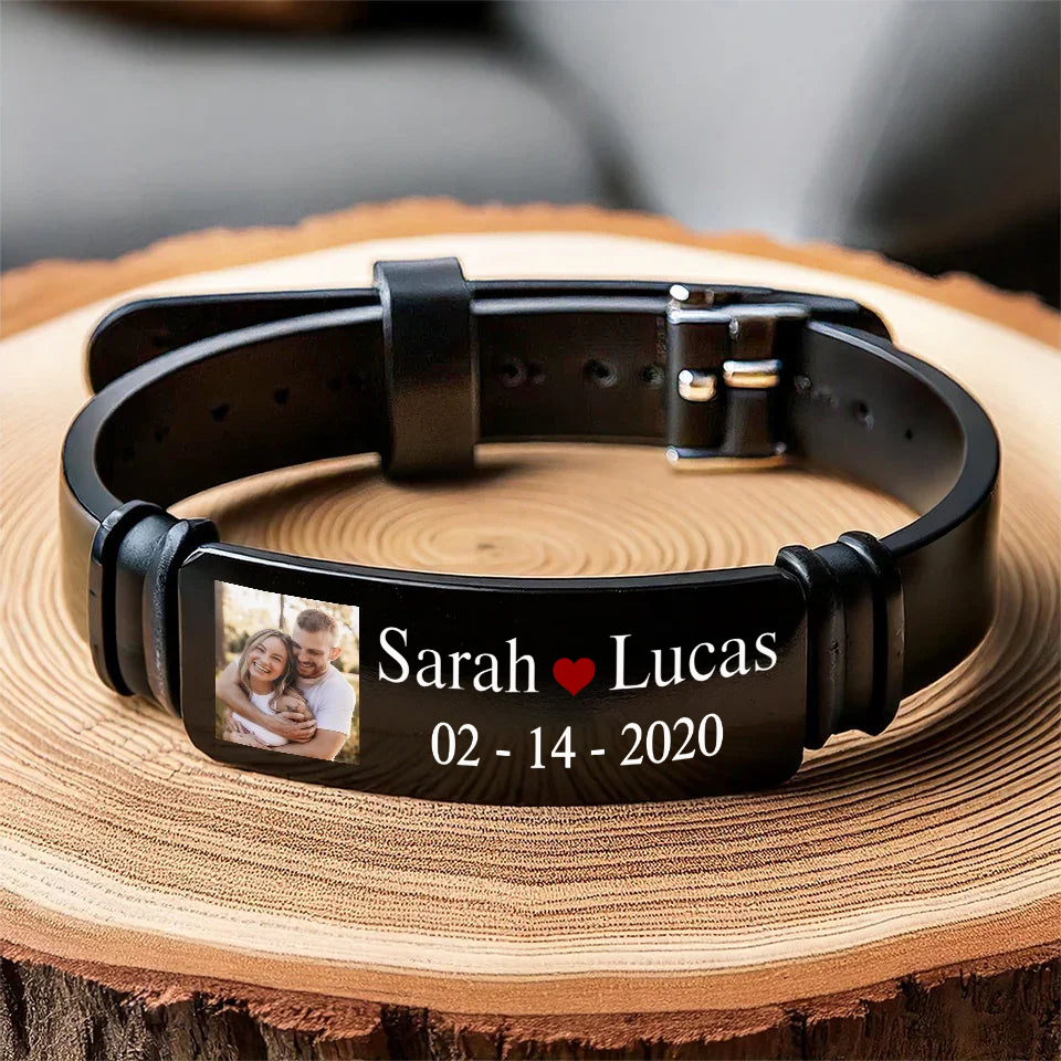 Bracelet en acier inoxydable avec photo et prénoms – Cadeau pour couple