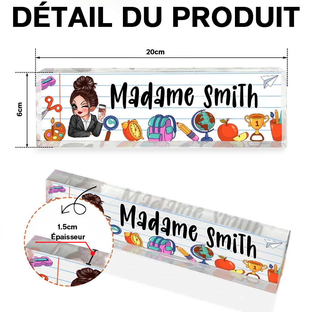 Plaque nominative en acrylique personnalisée – Pour enseignantes avec motif scolaire