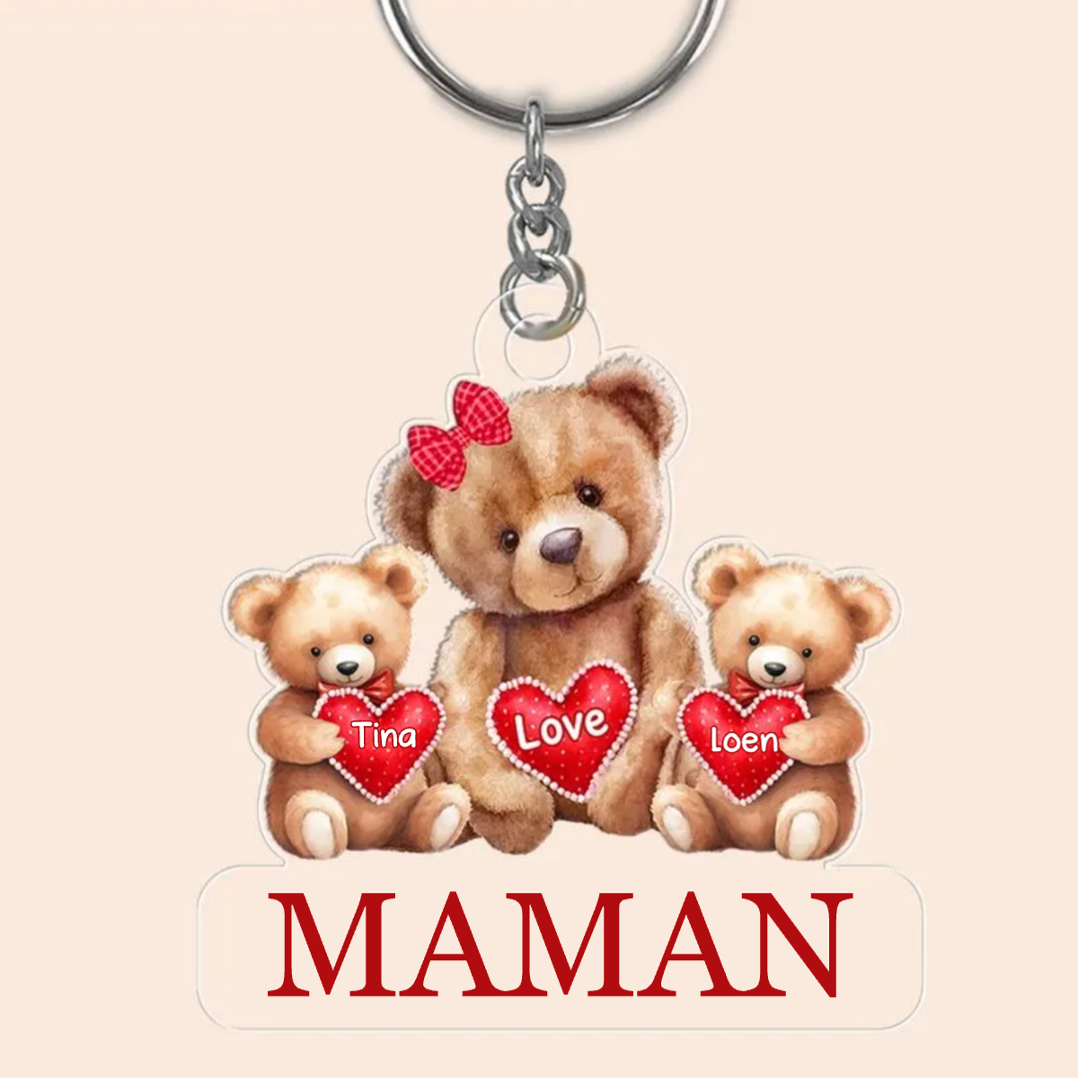 Que puis-je offrir à ma chère maman ou ma mamie bien-aimée pour la fête des mères ou la journée des grands-parents ? Notre porte-clés en acrylique personnalisable avec le motif d'une maman ours et de ses adorables oursons est le choix parfait !