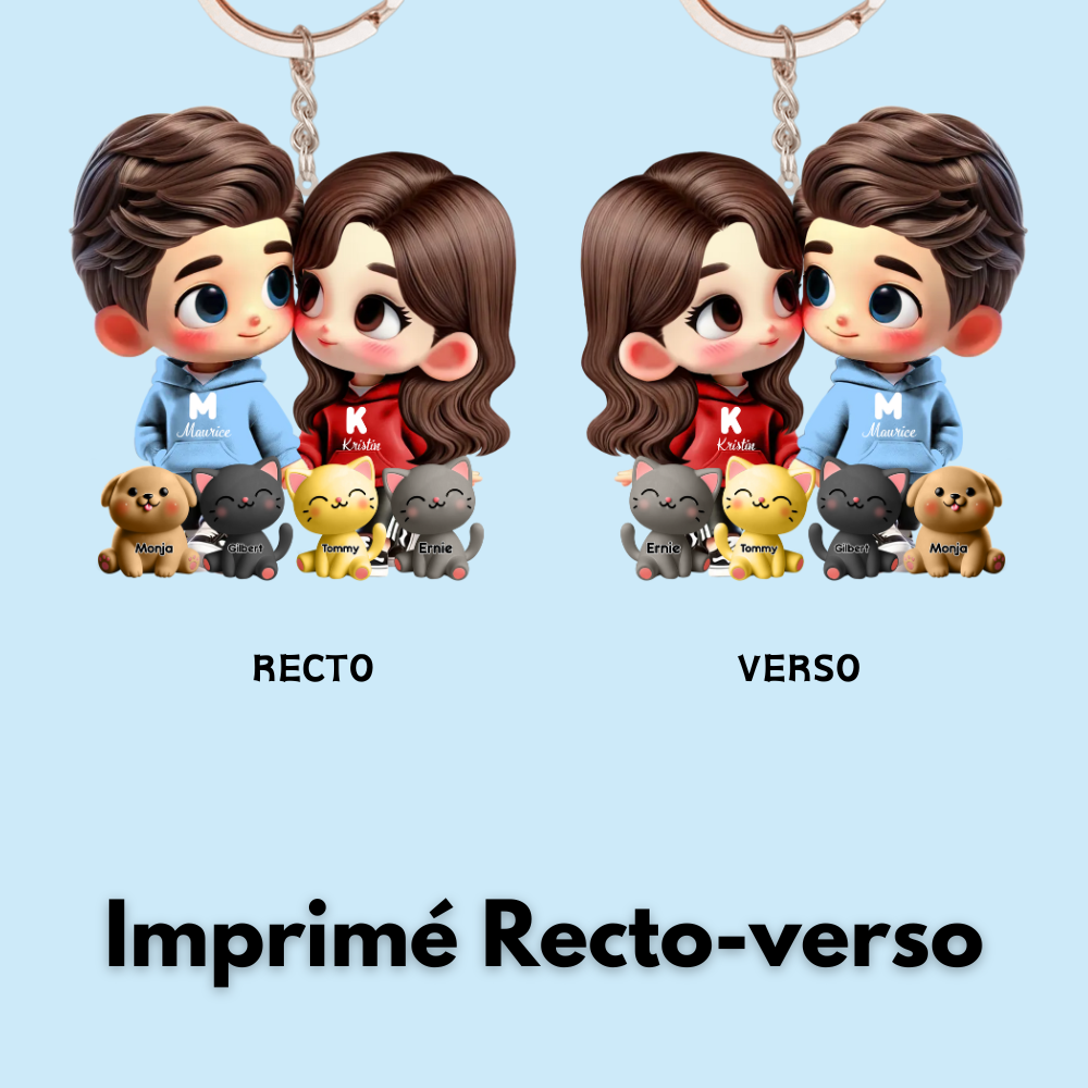 Porte-clés en acrylique personnalisé avec couple cartoon et animaux de compagnie – Cadeau pour couple